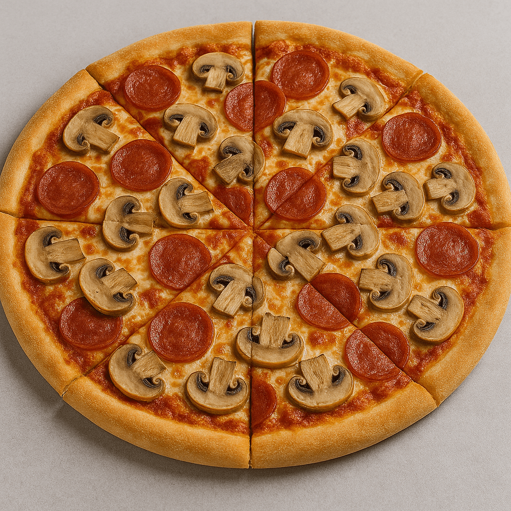 Frisch gebackene Pizza mit goldbraunem Teig, saftigem Käse, würziger Peperoni und Champignons. Ideal portioniert für zwei Personen – perfekt zum Teilen und Genießen.